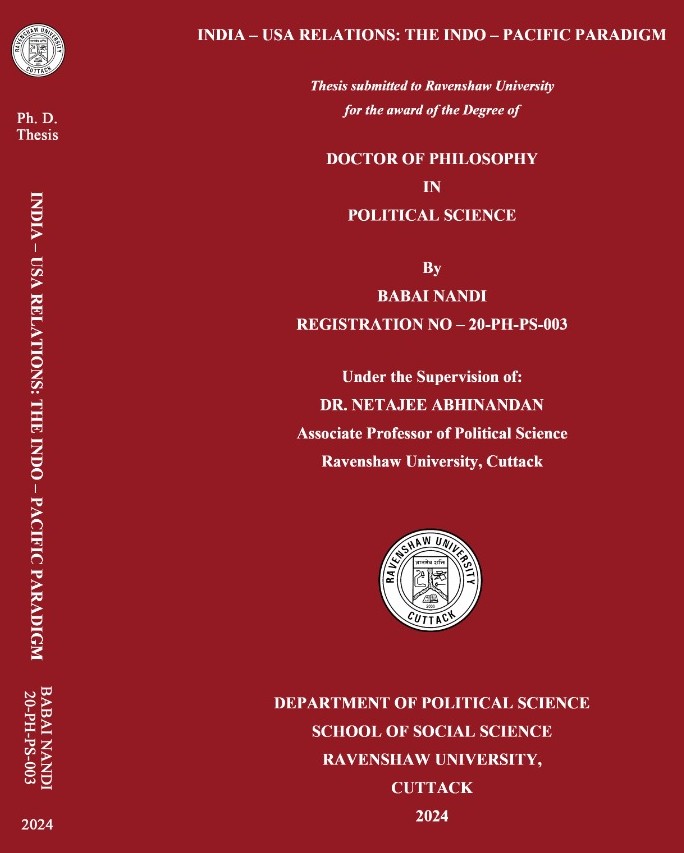 ରେଭେନ୍ସା ବିଶ୍ୱବିଦ୍ୟାଳୟର ରାଜନୀତି ବିଜ୍ଞାନ ବିଭାଗର ପ୍ରଫେସର ଡ଼ଃ ନେତାଜୀ ଅଭିନନ୍ଦନଙ୍କ ତତ୍ତ୍ୱାବଧାନରେ ସେ ଭାରତ ଓ ଆମେରିକା ବୈଦେଶିକ ସମ୍ପର୍କର କୁଟନୈତିକ ଓ ବିଭିନ୍ନ ଆନ୍ତର୍ଜାତିକ ଦିଗ ସମ୍ପର୍କରେ ସନ୍ଦର୍ଭ ପ୍ରସ୍ତୁତ କରି ପିଏଚଡ଼ି ଡିଗ୍ରୀର ଉପାଧିପ୍ରାପ୍ତ ହୋଇଛନ୍ତି । ଯାହାର ଚୂଡାନ୍ତ ପରୀକ୍ଷାରେ ଦିଲ୍ଲୀ ସ୍ଥିତ ଜବାହରଲାଲ ନେହେରୁ ବିଶ୍ୱବିଦ୍ୟାଳୟର ପ୍ରଫେସର ଅରବିନ୍ଦ କୁମାର ଏକ୍ସଟରନାଲ୍ ଭାବେ ଯୋଗ ଦେଇଥିଲେ ।
